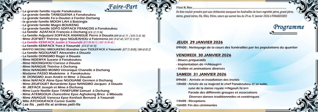 Honneur de te transmettre ci-dessous le faire-part des funérailles de mes parents(papa et maman, ainsi que les autres défunts de notre famille), prévues du 29 au 31 Janvier 2026 à Fonakeukeu par Dschang.